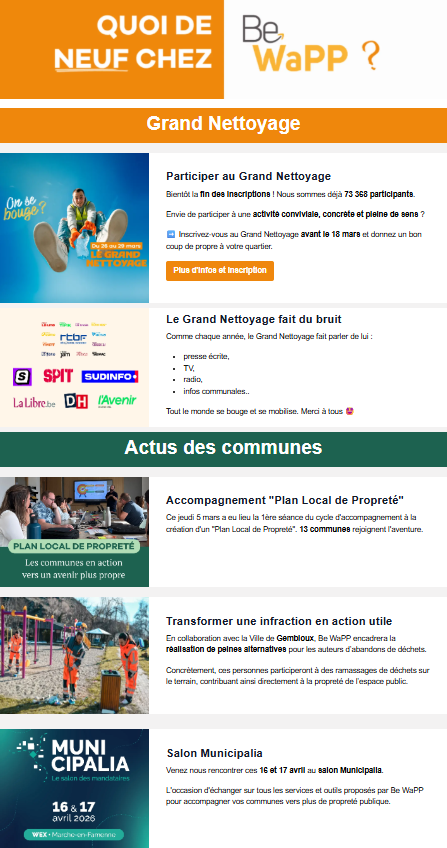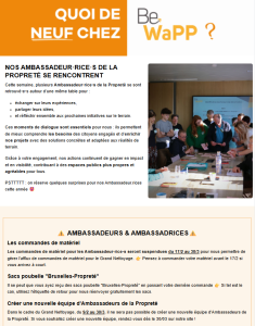 Lettre d’information digitale qui présente en quelques lignes (4 ou 5 sujets) l’actualité et les actions de terrain de l’asbl Be WaPP. Des liens vers le site internet www.bewapp.be permettent d’en savoir plus si vous le désirez.